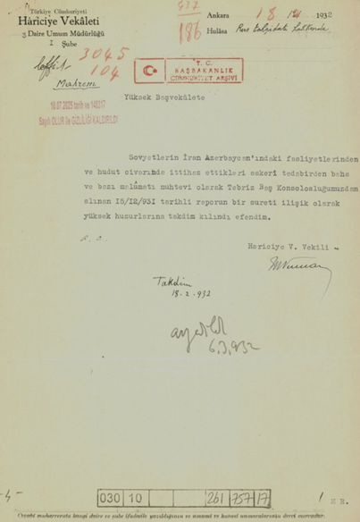 Türkiye Cumhuriyeti Devletinin Tebriz Konsolosluğunun 15 Aralık 1931 tarihli Güney Azerbaycan Türkleri Konusunda Raporu ![]() Tebriz’den Gönderilen Rapor ürkiye Cumhuriyeti Devlet Arşivleri’nde 2025 yılında gizliliği kaldırılan ve Türkiye’nin Tebriz Başkonsolosluğu tarafından gönderilen bir rapor, hükümetin Güney Azerbaycan’daki Türklüğe yönelik ilgisini ortaya koyması bakımından dikkat çekici bir kaynak niteliği taşıyor. 15 Aralık 1931 tarihli raporda, Sovyetlerin “İran Azerbaycanı” olarak tanımlanan bölgedeki faaliyetlerine değinilirken, Güney Azerbaycan Türklerinin durumu da ayrıntılı biçimde ele alındı. Belge, dönemin siyasi atmosferinde Türkiye’nin bölgedeki gelişmeleri yakından takip ettiğini ve Güney Azerbaycan’daki Türk kimliğine yönelik hassasiyetini ortaya koyuyor. Bu raporun gün yüzüne çıkması, hem tarihsel hafızanın yeniden değerlendirilmesine hem de Türkiye’nin Güney Azerbaycan politikalarının anlaşılmasına önemli katkı sağlıyor.