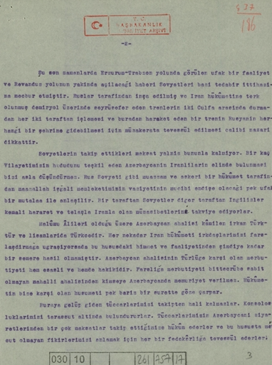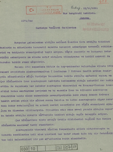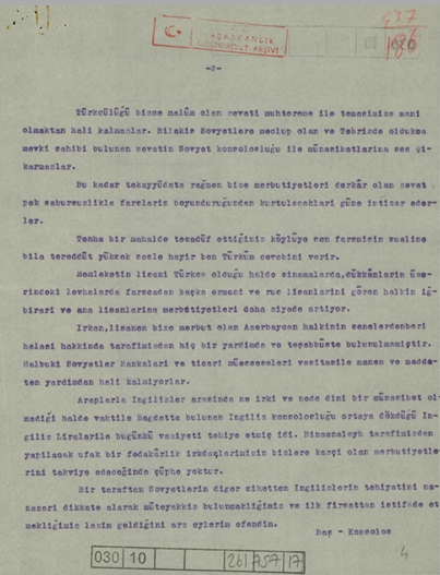 Arşiv Belgeleri Güney Azerbaycan’a Dair Türkiye’nin İlgi ve Hassasiyetini Ortaya Koyulmaktadır: Raporda, Sovyetlerin “İran Azerbaycanı” olarak tanımlanan bölgedeki faaliyetlerine değinilirken, Güney Azerbaycan Türklerinin durumu da ayrıntılı biçimde ele alındı. Belge, Türkiye’nin bölgedeki gelişmeleri yakından takip ettiğini ve Güney Azerbaycan’daki Türk kimliğine yönelik hassasiyetini ortaya koyması bakımından dikkat çekici bir kaynak niteliği taşıyor. Uzmanlar, söz konusu raporun gün yüzüne çıkmasının tarihsel hafızanın yeniden değerlendirilmesine ve de Türkiye’nin Güney Azerbaycan politikalarının anlaşılmasına önemli katkı sağlayacağını belirtiyor.